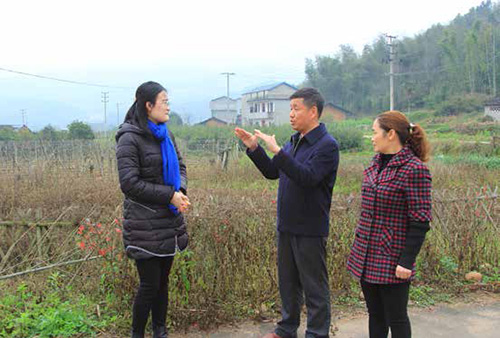 林善平代表(中)走訪回鄉(xiāng)的大學(xué)畢業(yè)生施穎( 左一),鼓勵(lì)她扎根山區(qū),為山區(qū)發(fā)展貢獻(xiàn)聰明才智。攝影/ 王爭(zhēng)