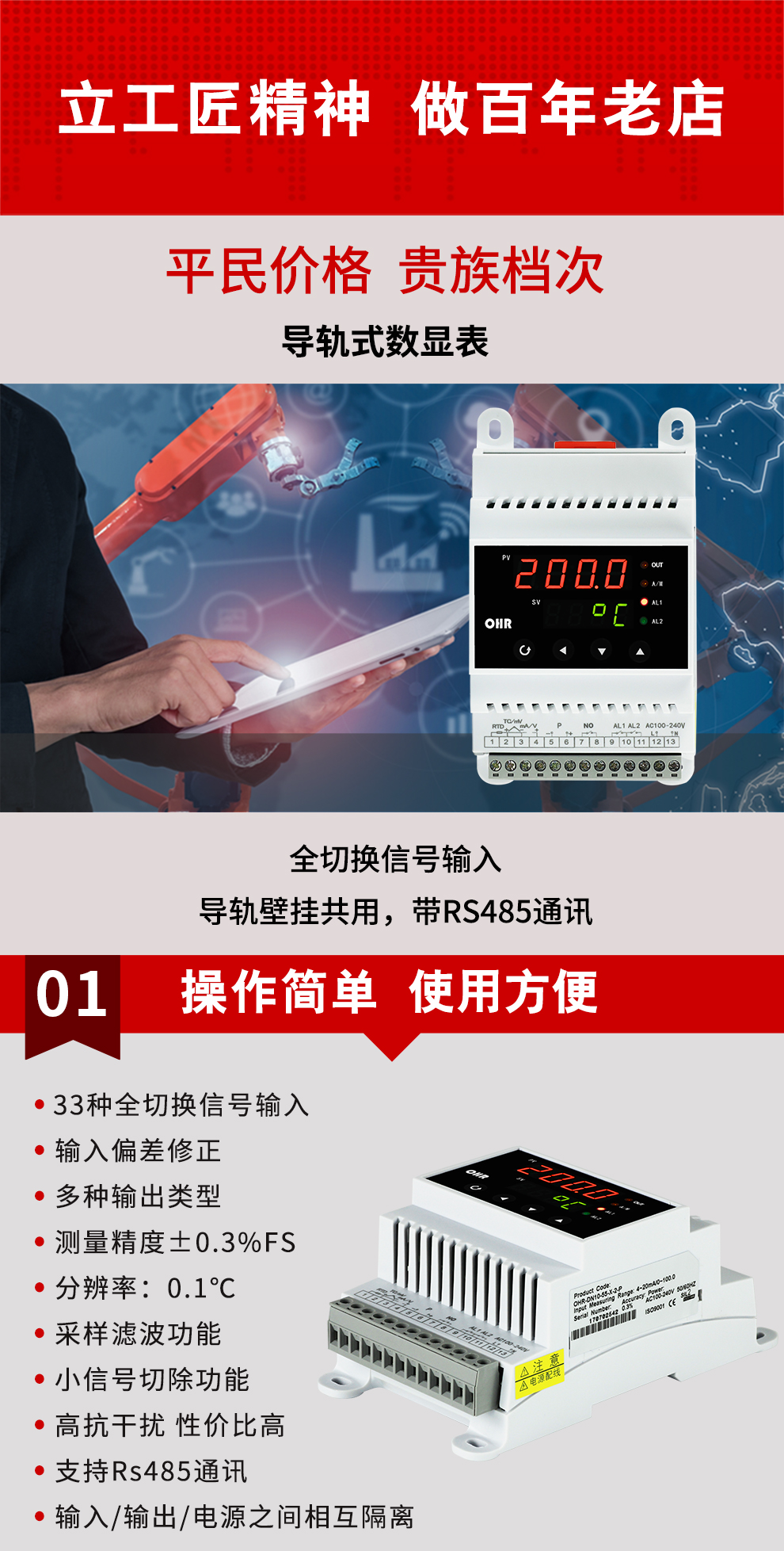 虹潤公司是專業(yè)生產(chǎn)數(shù)顯表的國家專精特新“小巨人”企業(yè),生產(chǎn)的導(dǎo)軌式數(shù)顯儀表,具有全切換信號(hào)輸入,導(dǎo)軌壁掛共用,全隔離設(shè)計(jì),高抗干擾,變送輸出或RS485通訊等特點(diǎn)。產(chǎn)品獲得巡回檢測顯示方法及裝置、工業(yè)模塊的導(dǎo)軌式安裝結(jié)構(gòu)等2項(xiàng)國家發(fā)明專利,主持起草工業(yè)過程控制系統(tǒng)用模擬輸入兩位或多位輸出儀表、物聯(lián)網(wǎng)智能溫度儀表通用技術(shù)條件等2項(xiàng)國家標(biāo)準(zhǔn),,以及通信系統(tǒng)多通道數(shù)據(jù)采集控制終端規(guī)范軍用標(biāo)準(zhǔn),參與國際5G標(biāo)準(zhǔn)制定,取得簡易數(shù)顯儀表等3項(xiàng)相關(guān)軟件著作權(quán)。產(chǎn)品廣泛應(yīng)用于電力、石化、冶金、化工、造紙、食品、輕工、制藥、熱處理、水處理、機(jī)械配套等各種工業(yè)現(xiàn)場。